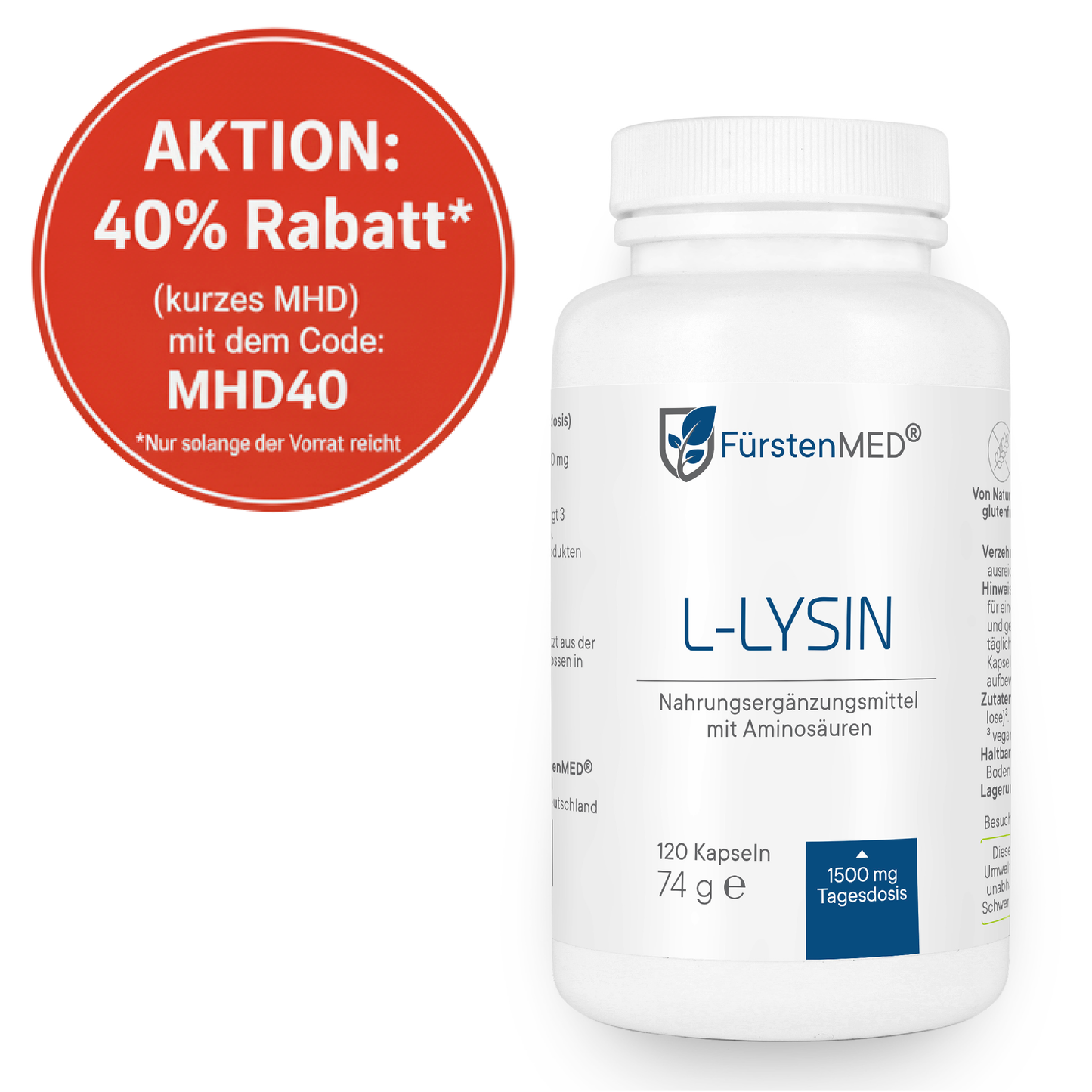 SALE - FürstenMED L-Lysin 120 Kapseln kurzes MHD (31.01.2026) - 40% Rabatt mit dem Code: MHD40
