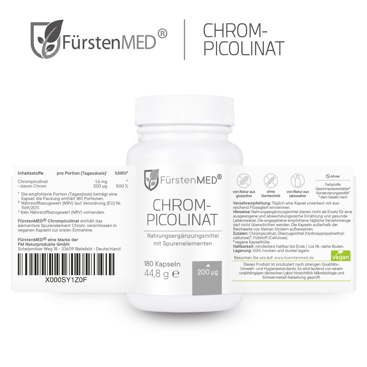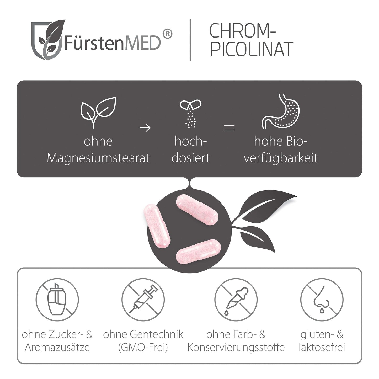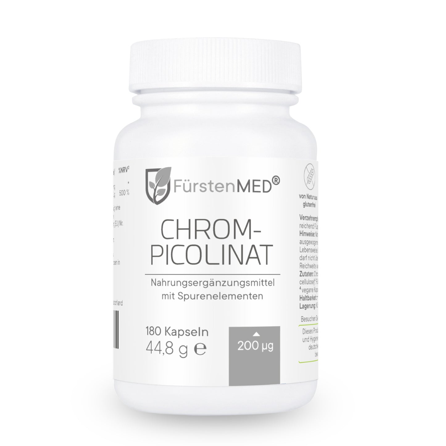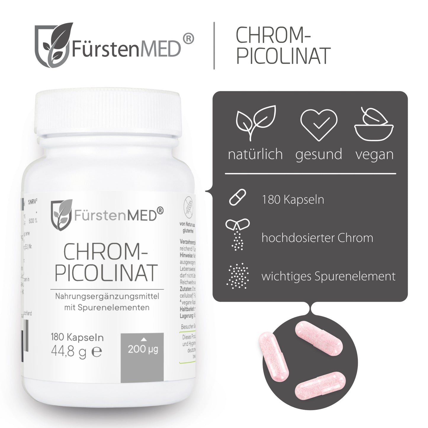 Die FürstenMED® Chrom-Picolinat Kapseln mit Spurenelementen bieten eine natürliche Versorgung mit Chrom bei höchster Bioverfügbarkeit für den Körper. Dieses Produkt wird in Deutschland unter Einhaltung höchster Qualitätsstandards- und Hygienerichtlinien produziert. Labor geprüft und frei von jeglichen Zusätzen.