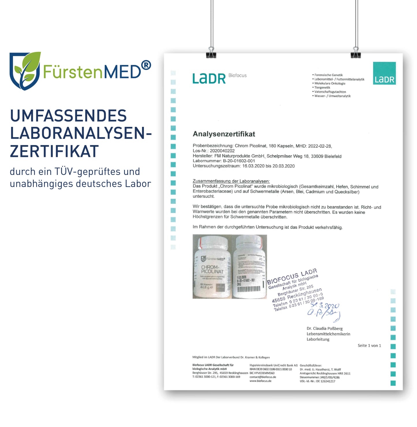 Die FürstenMED® Chrom-Picolinat Kapseln stammen aus deutscher ISO- und HACCP-zertifizierter Produktion unter strenger Einhaltung höchster Qualitätsstandards. Der bewusste Verzicht auf Zusatzstoffe wie Magnesiumstearat (Magnesiumsalz der Speisefettsäuren) oder Titandioxid sorgt für eine verbesserte Bioverfügbarkeit.