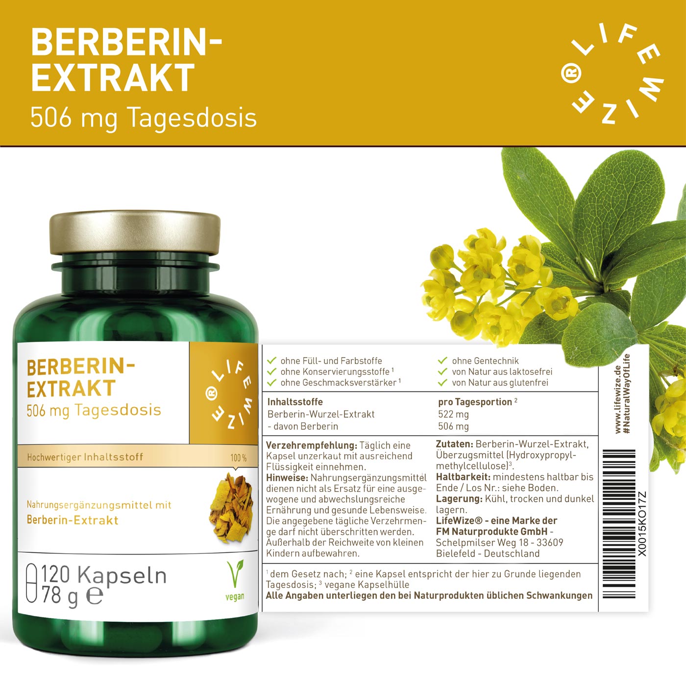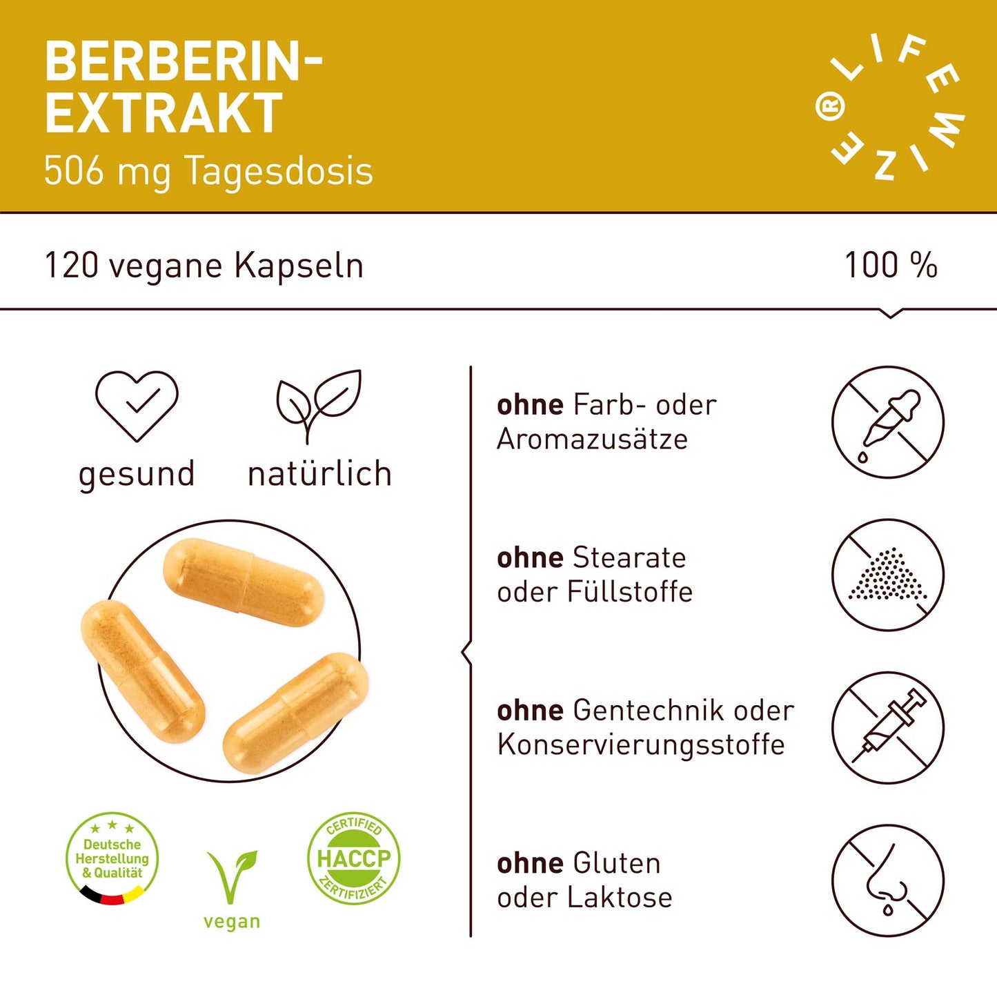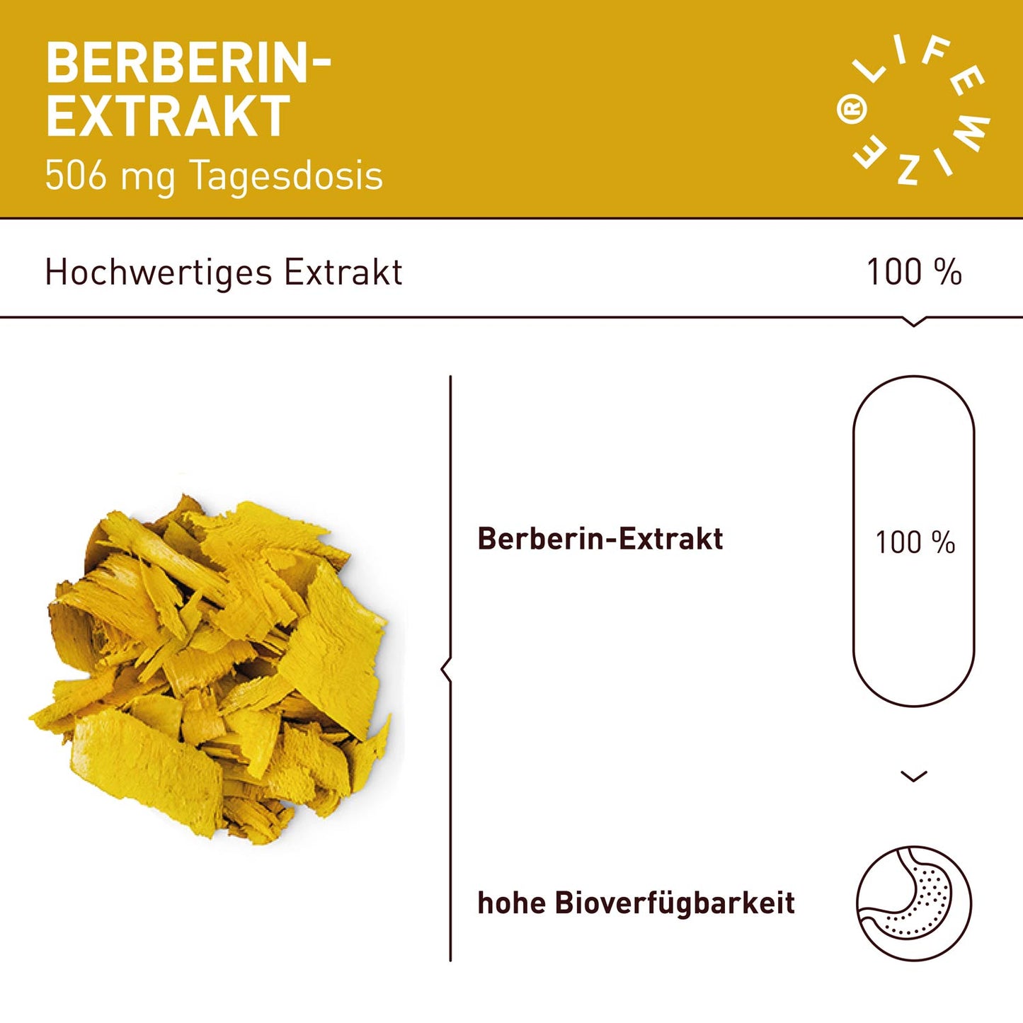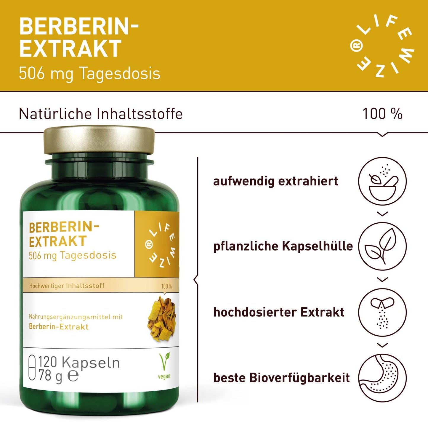 Die LifeWize® Berberin Kapseln aus hochwertigem Berberin-Wurzel-Extrakt sind ein Nahrungsergänzungsmittel, das sich durch höchste Bioverfügbarkeit für den Körper auszeichnet. Dieses Produkt wird in Deutschland unter Einhaltung höchster Qualitätsstandards- und Hygienerichtlinien produziert. Labor geprüft und frei von jeglichen Zusätzen.